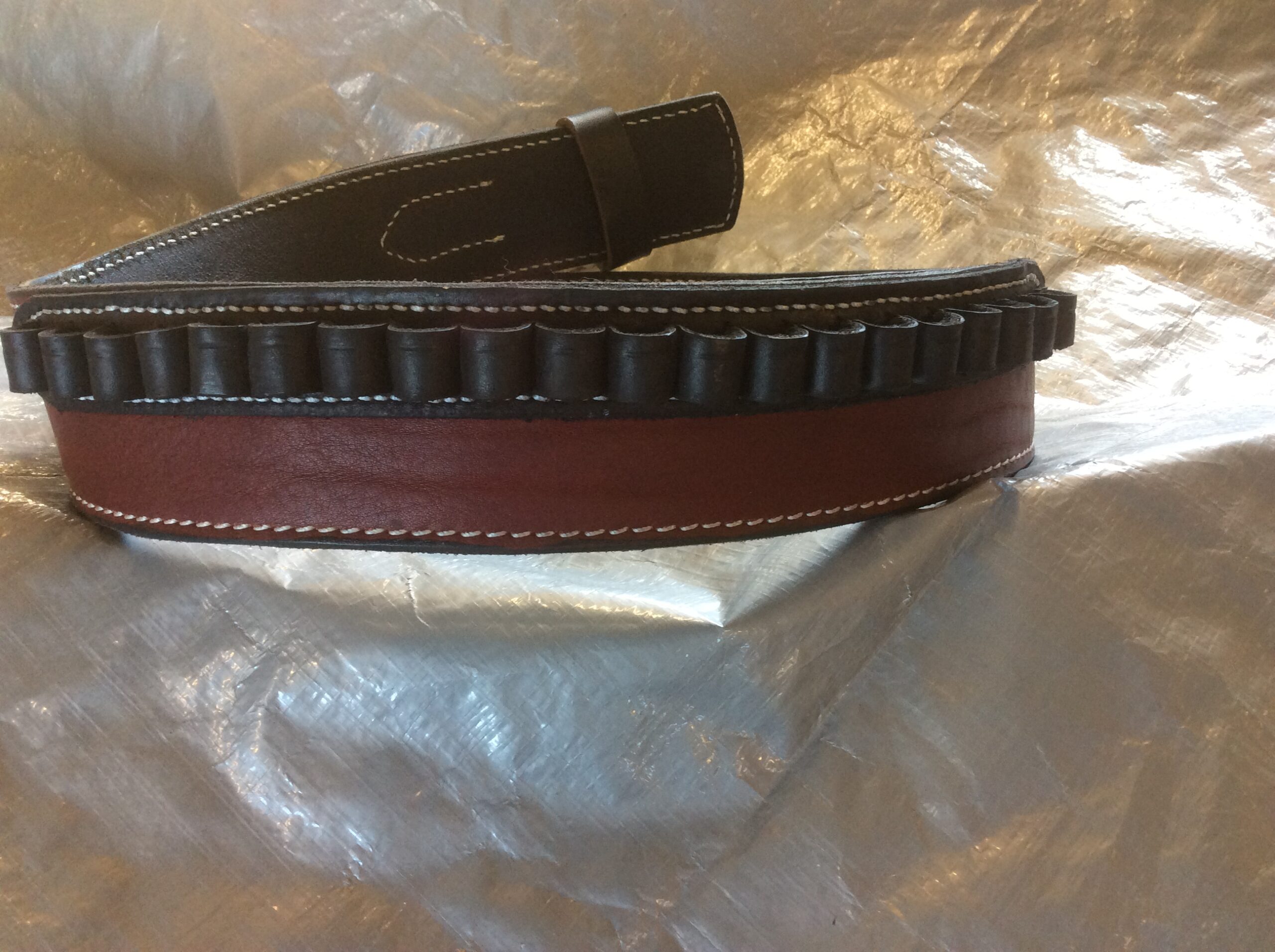 A customer brought us this belt to add bullet loops . The body of the belt is in mahogony with black lining and a black billet strap . We added bullet loops for 44 cal using black leather with white stitching to match the existing stitch .