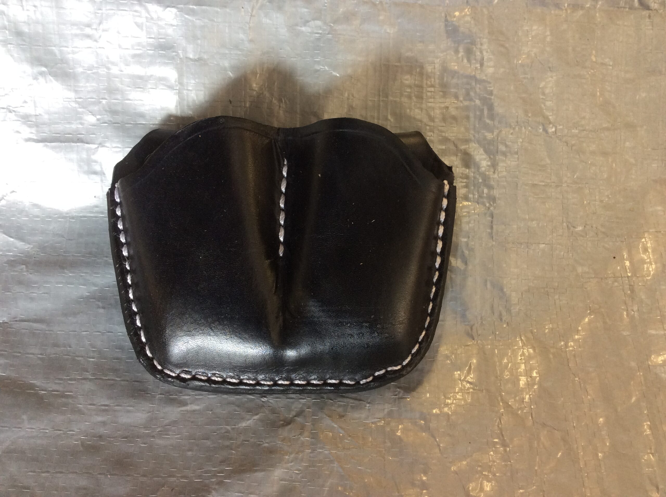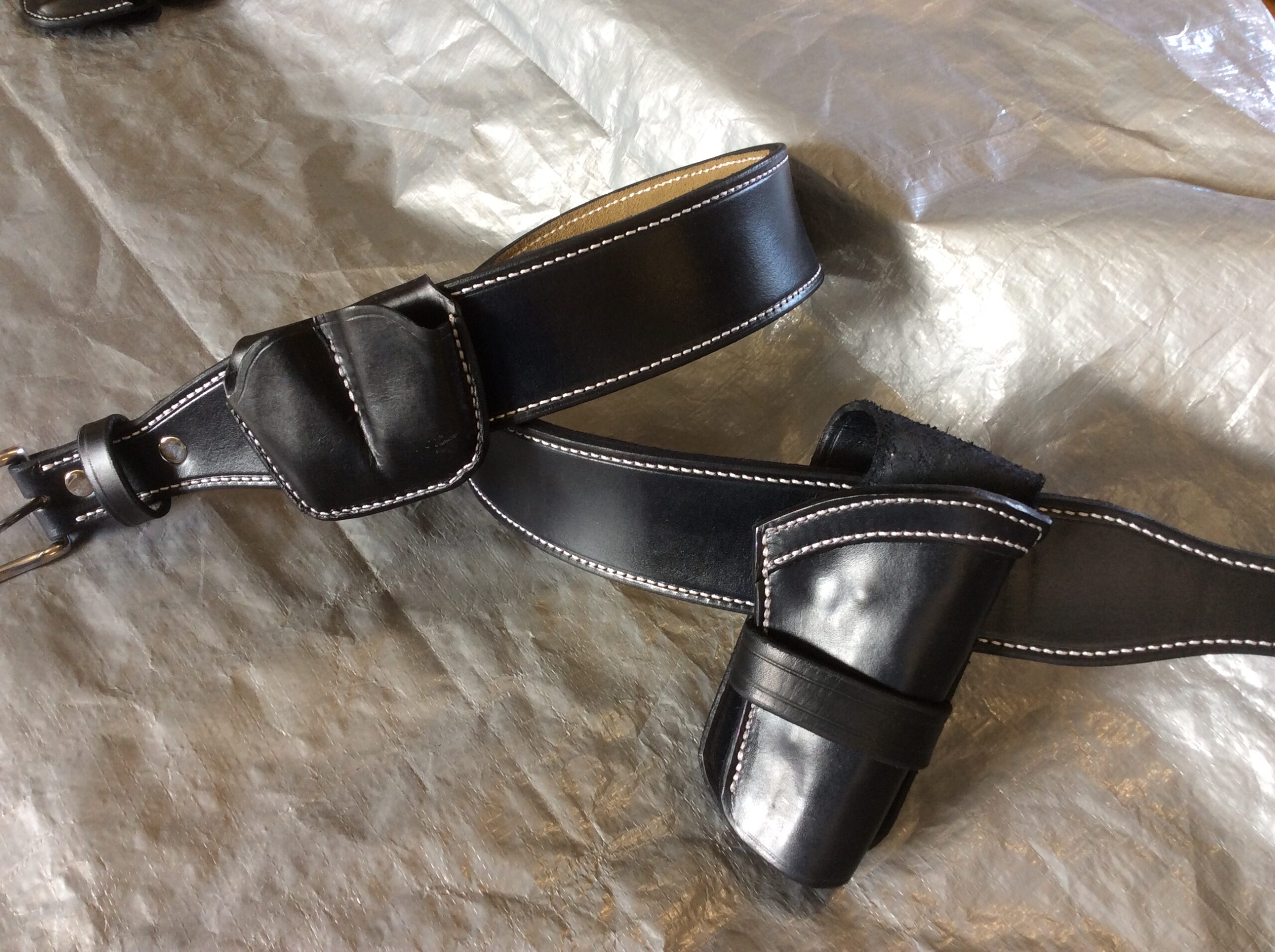 Shown in black with white stitching . This wild bunch rig has a suede lined belt for added grip , the holster is unlined yet has a reinforcing cuff which holds the holster firm at the top . Comes with a double mag pouch .